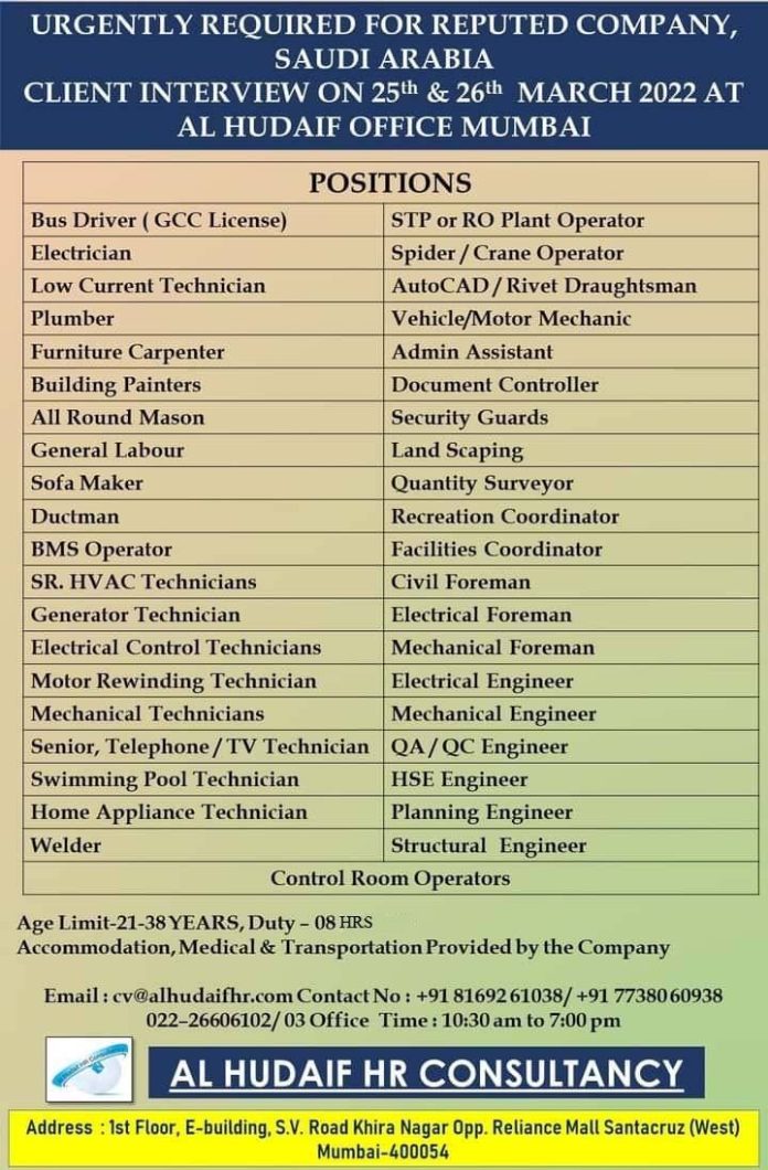Walk-in-interview on 25th and 26th at Al Hudaif office in Mumbai