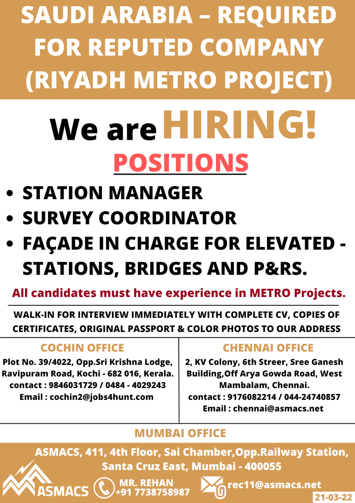 Email: rec11@asmacs.net, cochin2@jobs4hunt.com, chennai@asmacs.net