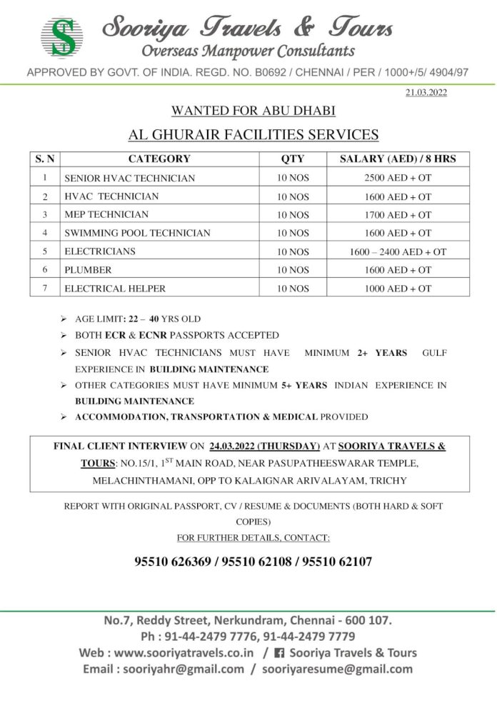 Sooriya Travels & Tours, No: 15/1, 1st Main Road, Near Pasupatheeswarar Temple, Melachinthamani, Opp to Kalaignar Arivalayam, Trichy, Email : sooriyhr@gmail.com / sooriyaresume@gmail.com