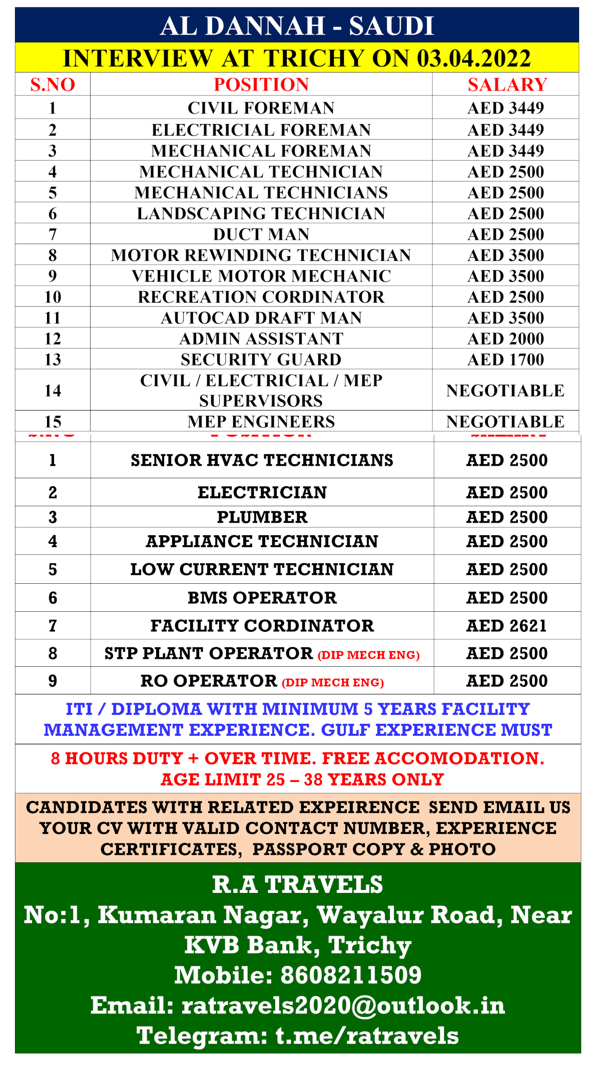 | Civil/electrical/MEP supervisors | Negotiable | |