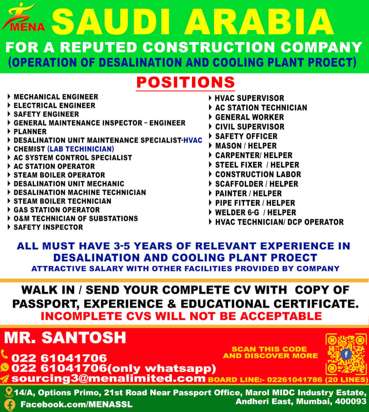 Saudi job vacancy 2022 - Operation of Desalination & Cooling Plant Project