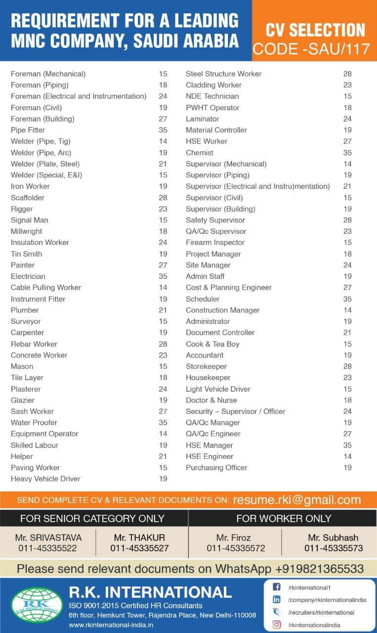 Saudi arabia job vacancy for Indian - MNC Company