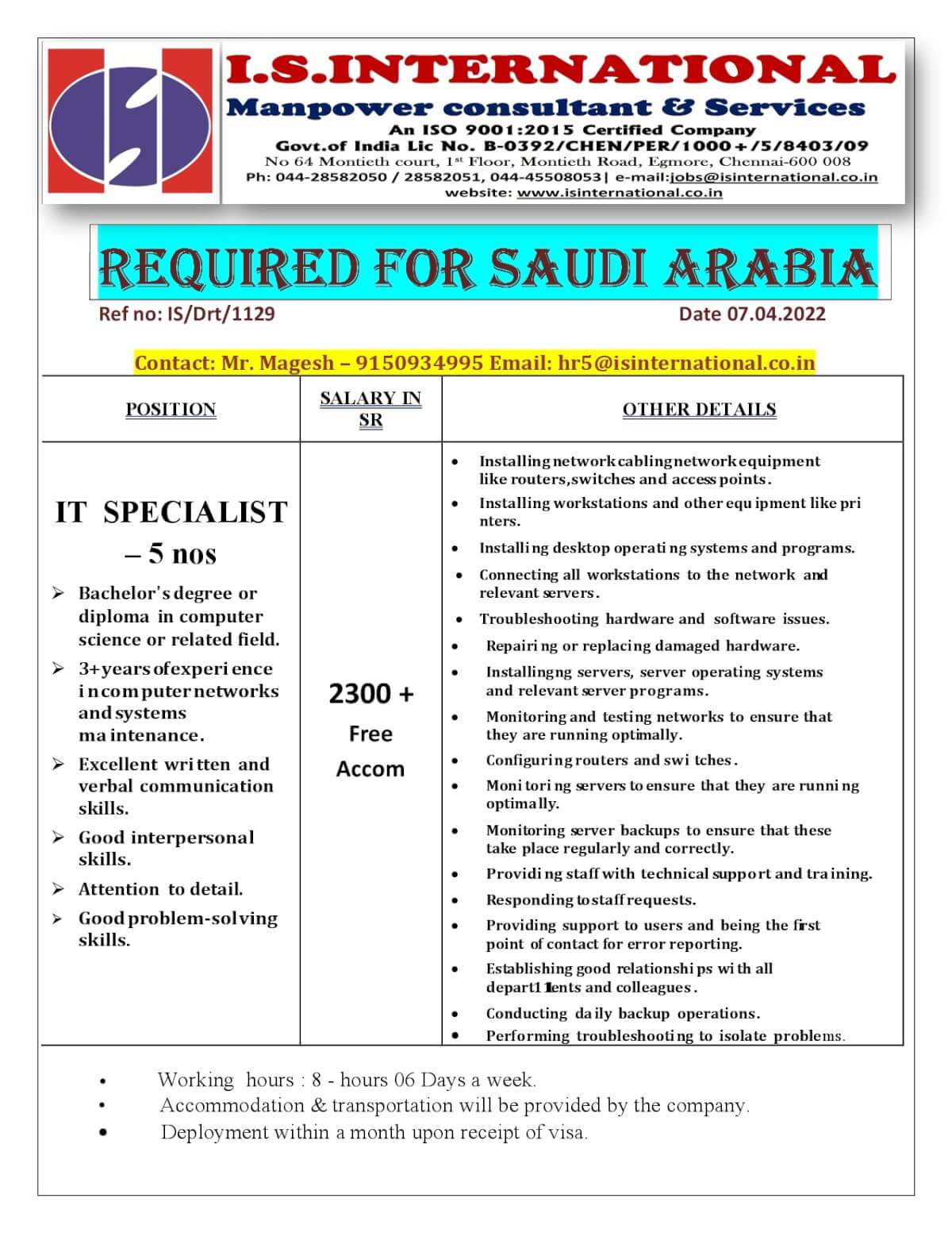 IT Jobs in Saudi Arabia for Indian - IT Specialist