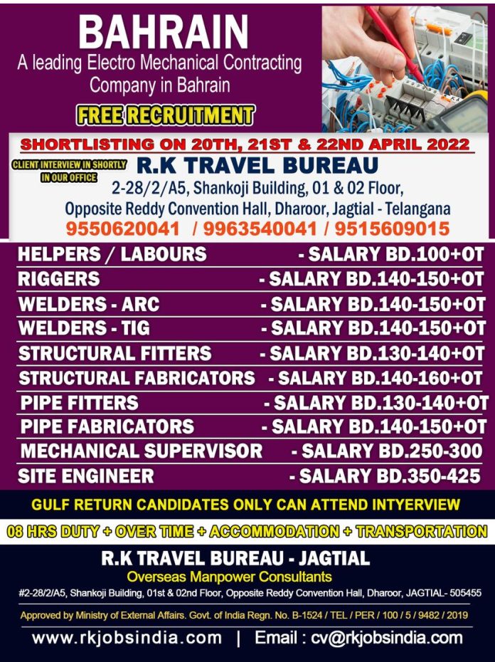 Free recruitment to Bahrain - Electro Mechanical Company