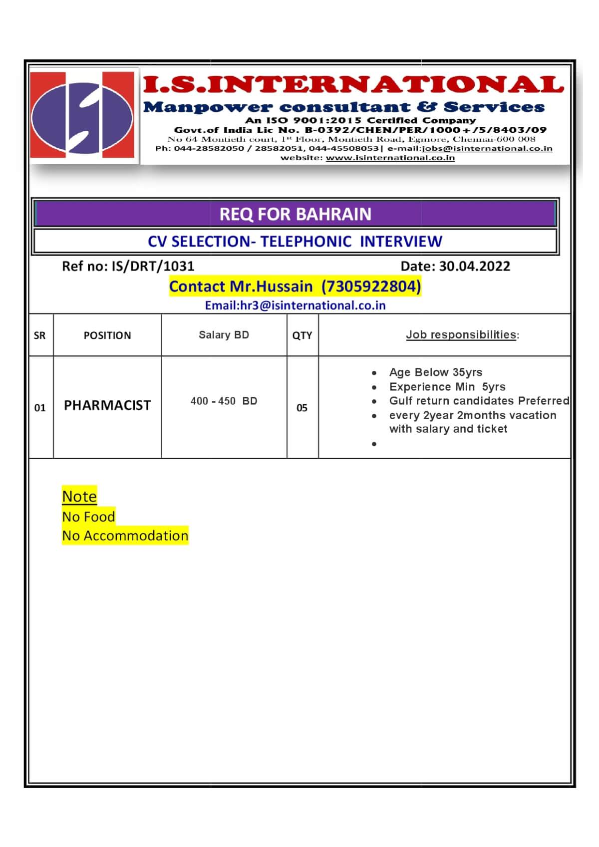 Pharmacist | 5 | 450 BD |