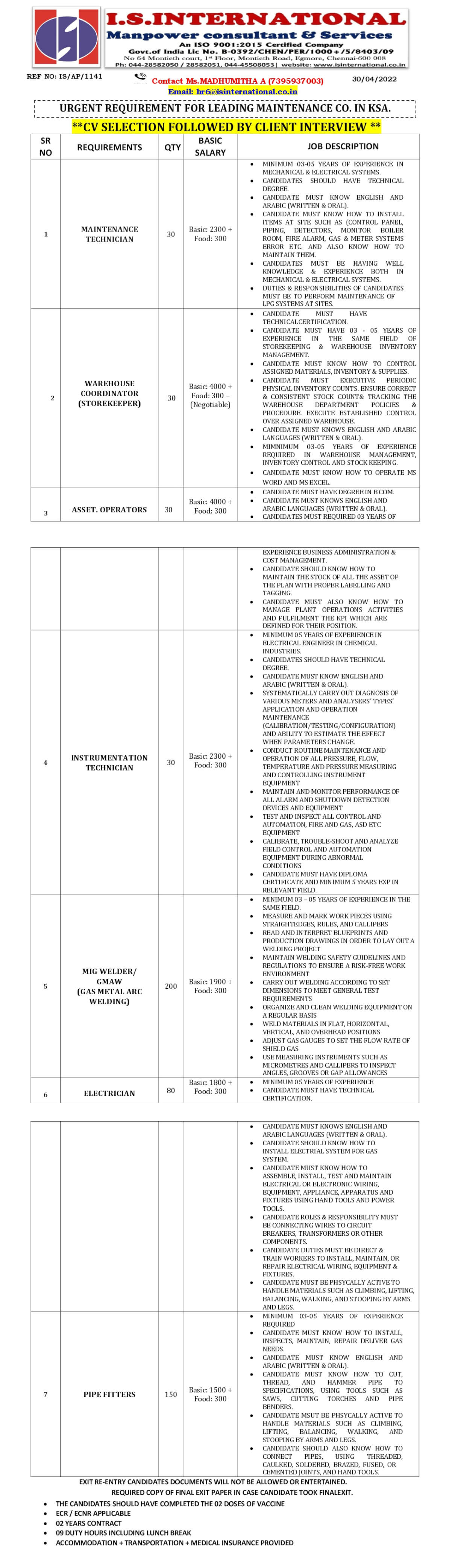 | Instrumentation technician | 30 | 2600 SAR |