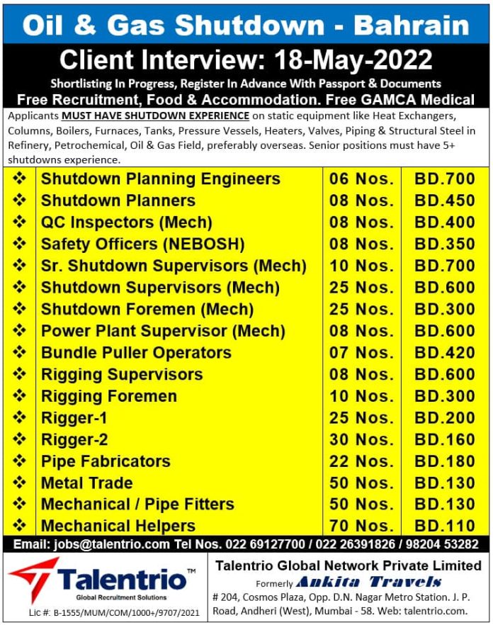 Senior shutdown supervisors (mechanical) | 10 | 700 BD |