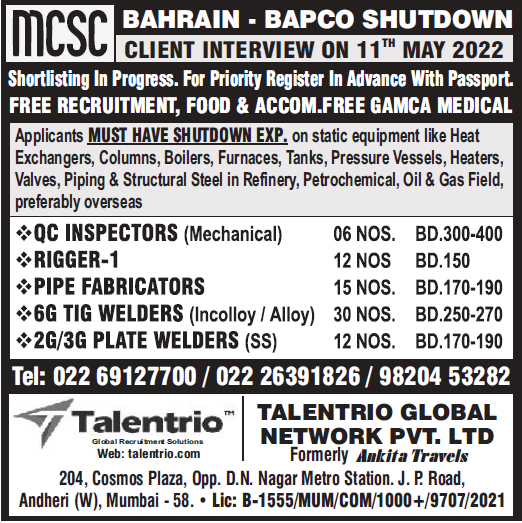 MCSC Bahrain vacancy 2022 - Free recruitment to BAPCO shutdown