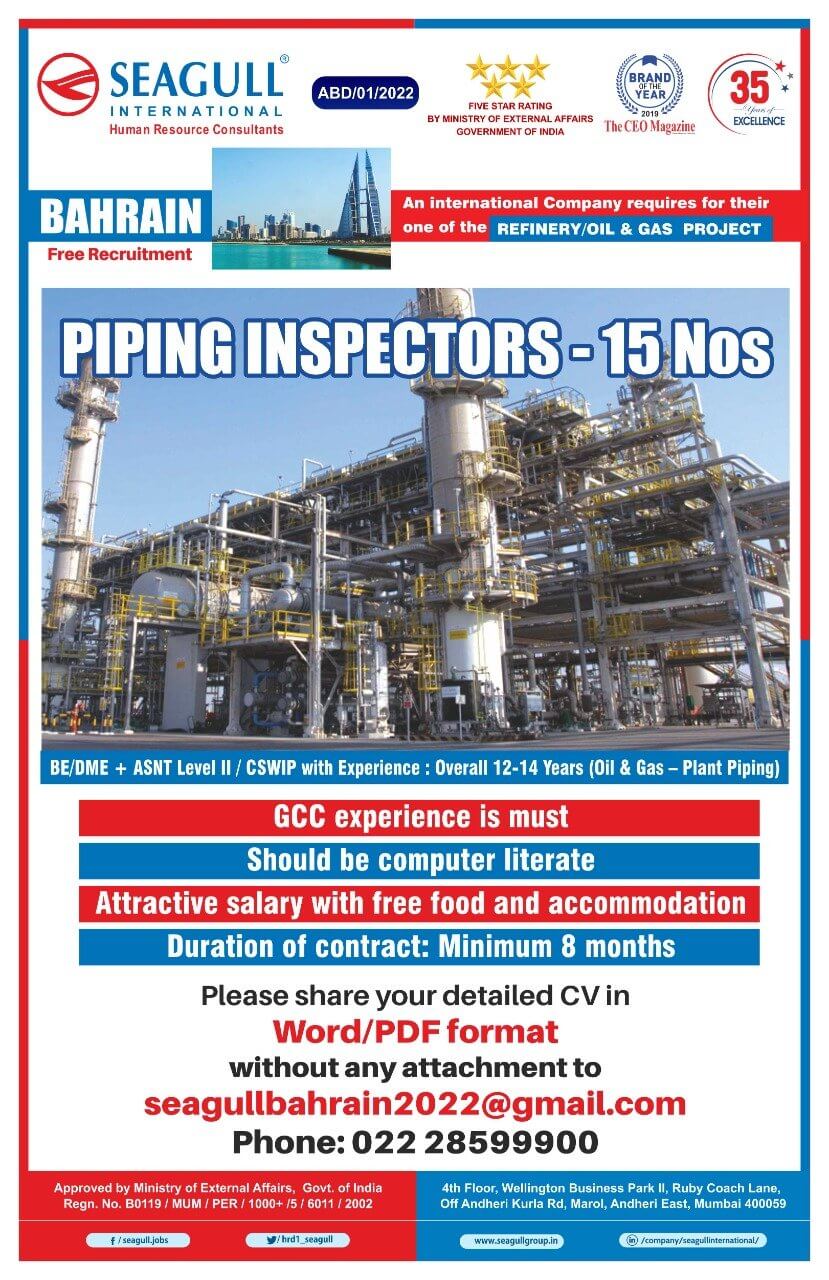 Piping Inspector Jobs in Bahrain - Free recruitment