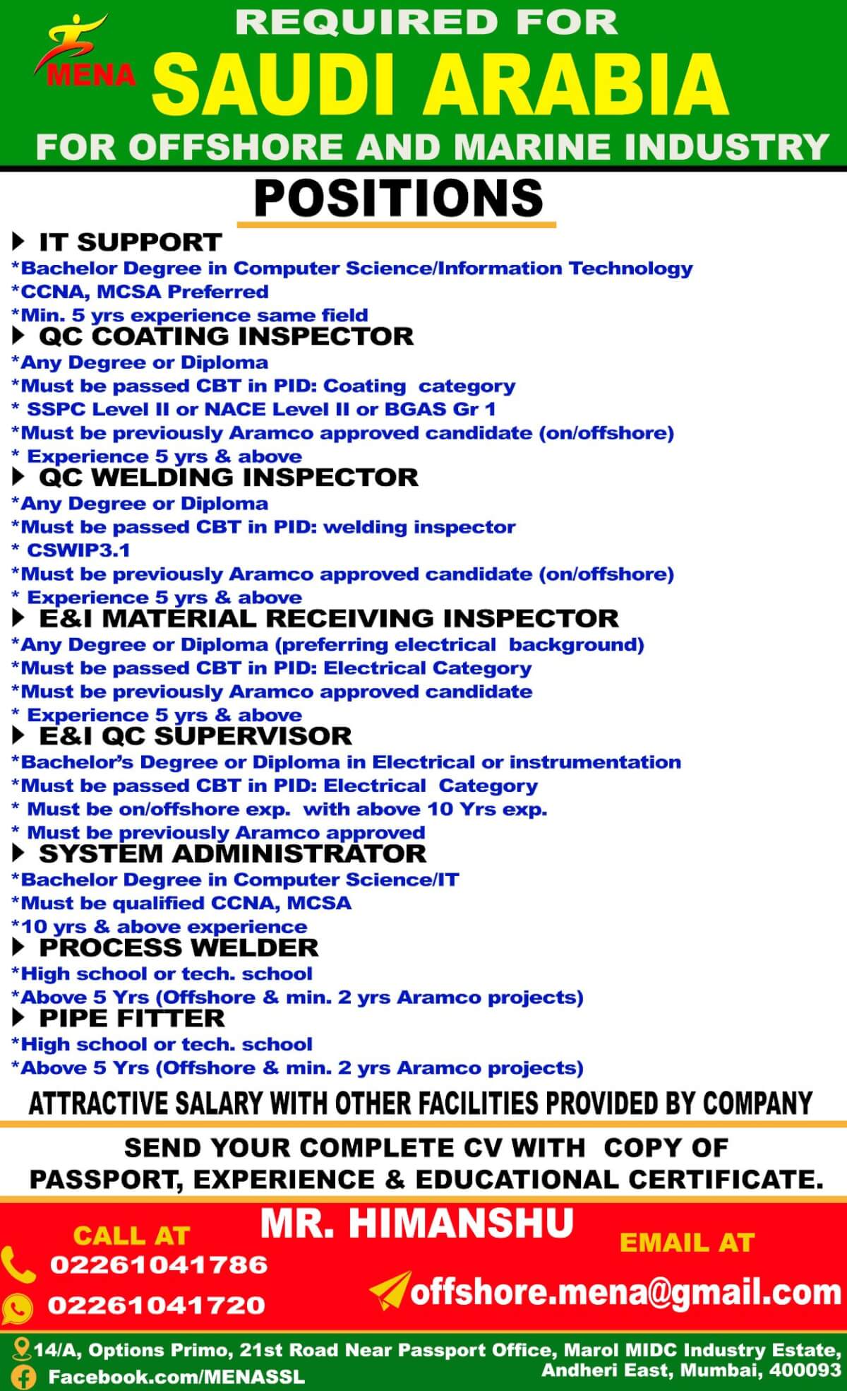Saudi Arabia job vacancy for Indian - Offshore & Marine Industry