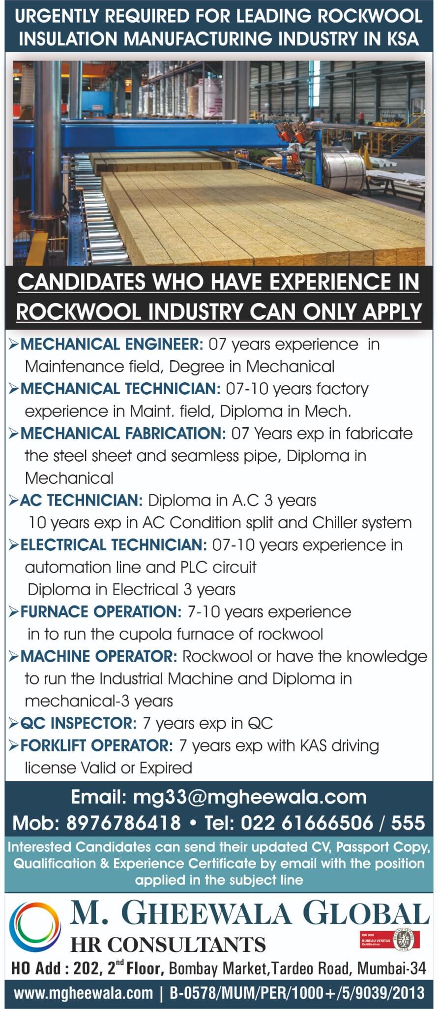 Saudi Arabia job vacancy for Indian - Rockwool Industry