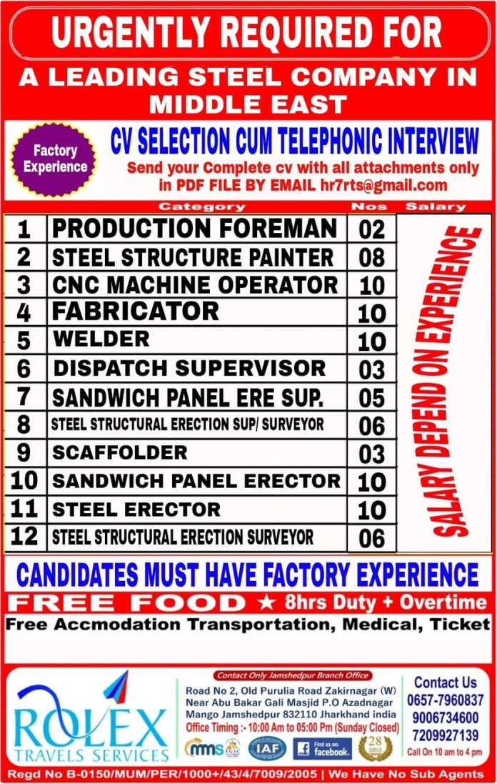 Steel plant vacancy in Gulf 2022 - Urgently required