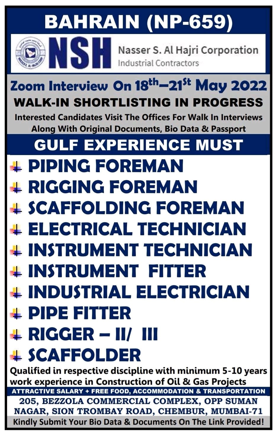 NSH Bahrain Vacancy 2022 - Urgently required