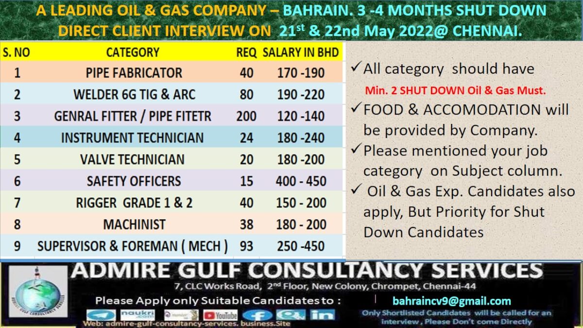 Bahrain oil and gas company job vacancy - Shutdown project