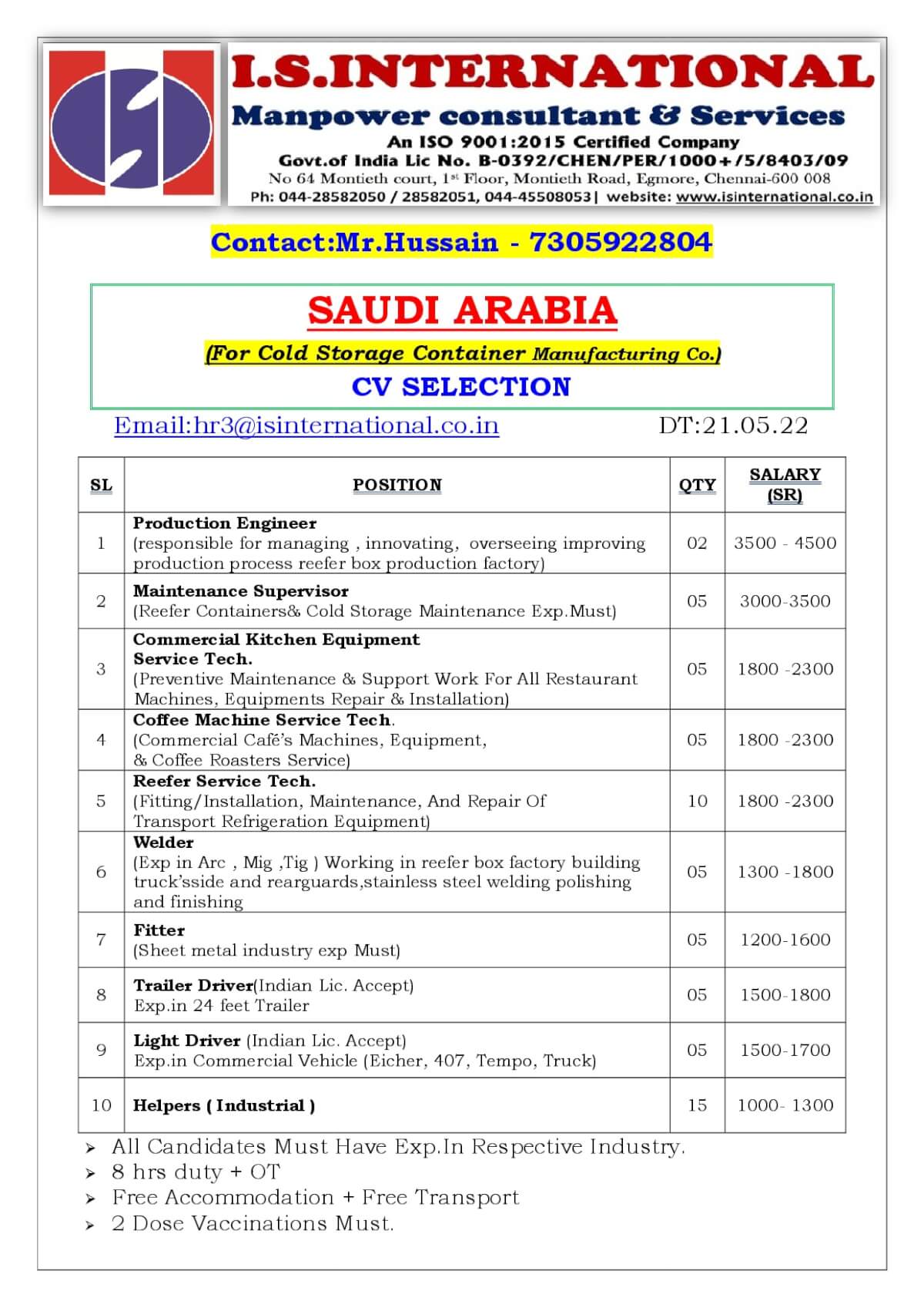 Recruitment to Saudi arabia - Cold Storage Container Manufacturing Company