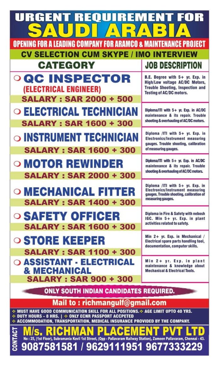 | QC inspector (electrical engineer) | 2500 SAR | |