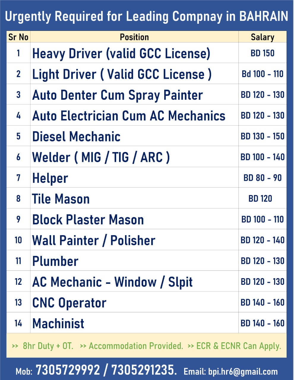 Bahrain Job vacancies for Indian - Urgently required