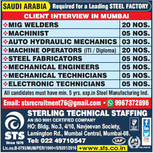All candidates must have minimum 5 years experience in steel manufacturing industry