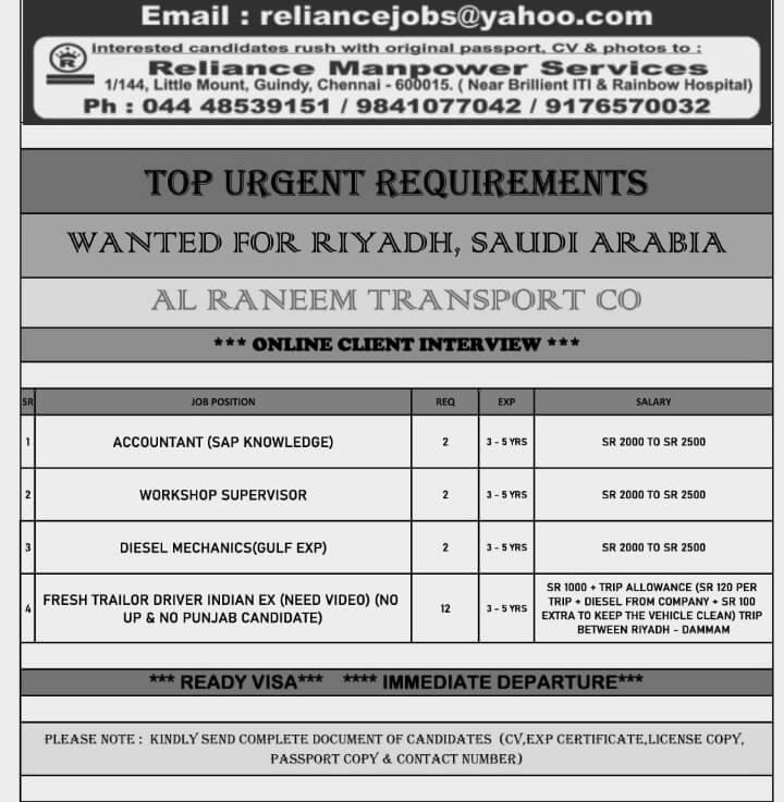 Al Raneem Transport company Saudi arabia - Urgent hiring