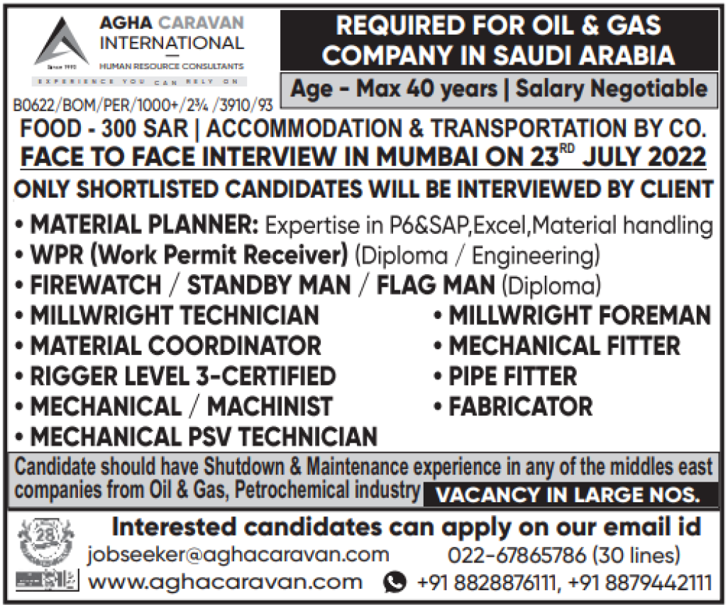 Candidates must have shutdown & maintenance experience in middle east companies from oil & gas, petrochemical industry