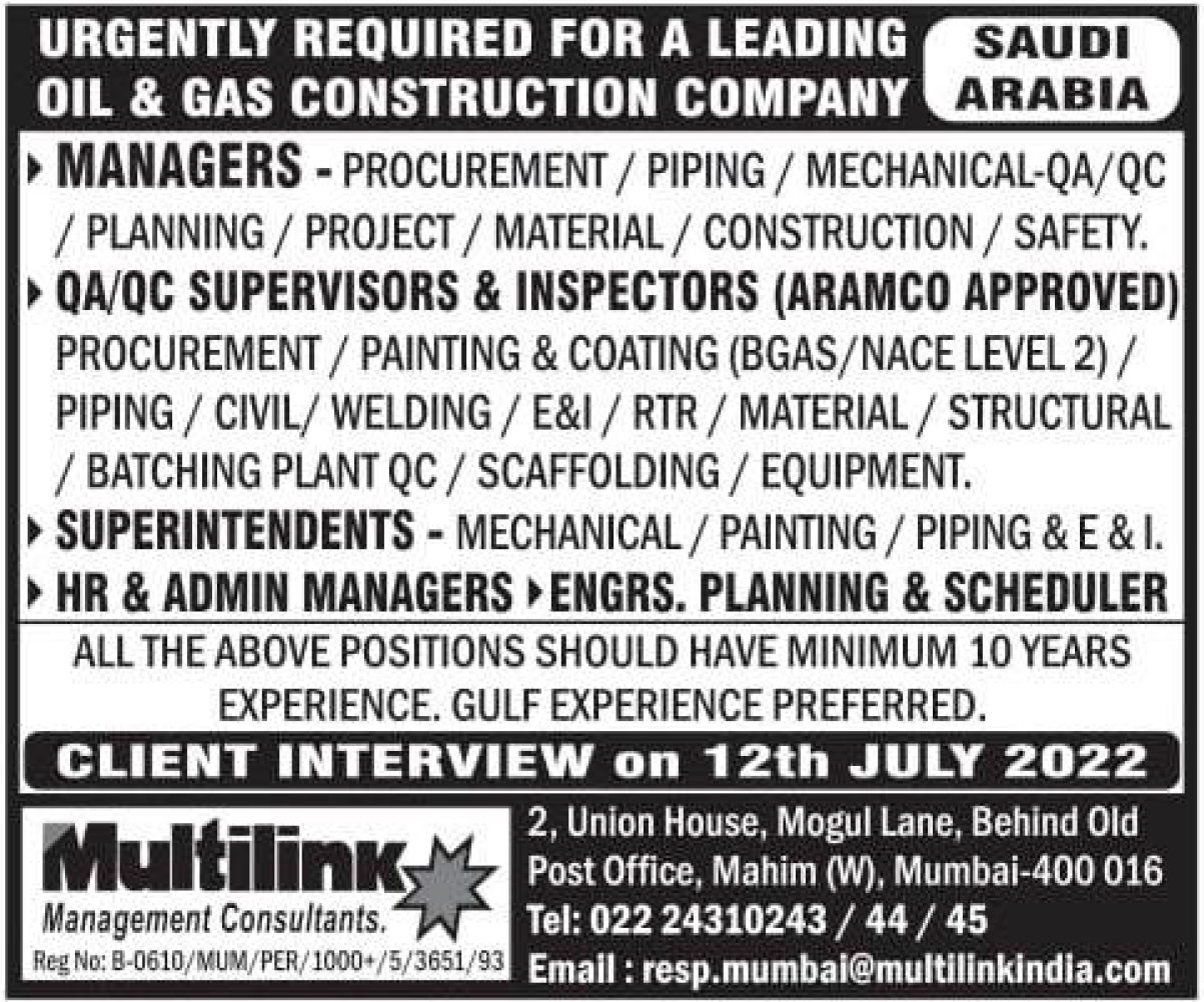 QA/QC supervisors & inspectors (ARAMCO approved) - procurement/painting & coating (BGAS/NACE level 2)/piping/civil/welding/E & I, RTR, Material/structural/batching plant QC/scaffolding/equipment | ||