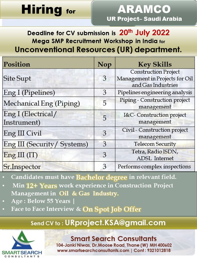 Candidates Must have Bachelor Degree in relevant field. Minimum 12+ years work experience in construction project Management in Oil & Gas Industry. Age below 55 years