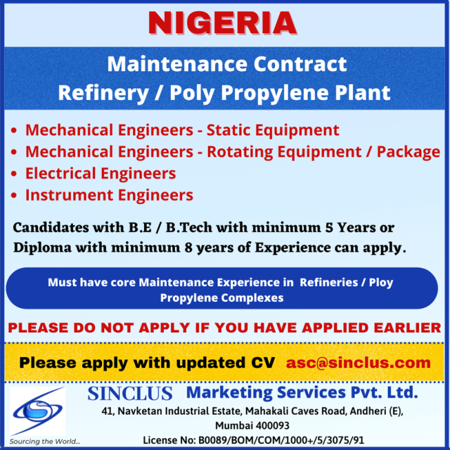 Must have core experience in refineries/poly propylene complexes