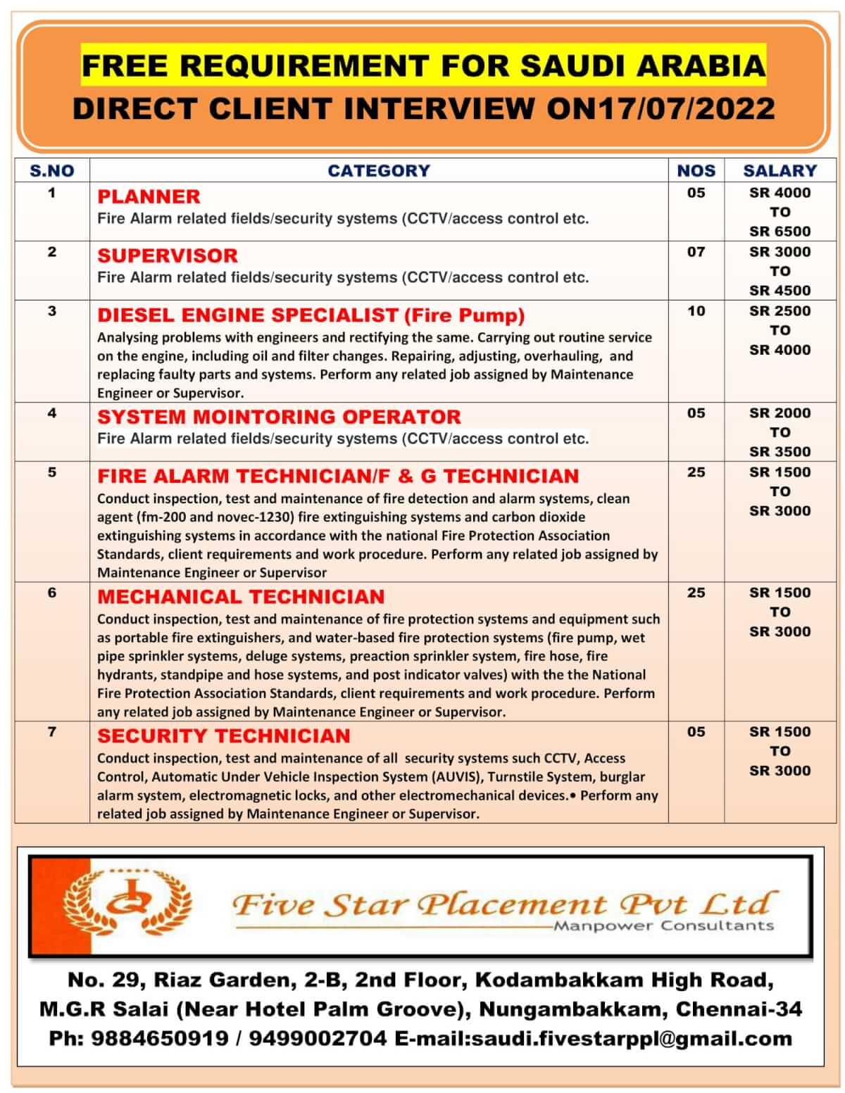 | Fire alarm technician/F & G technician | 25 | 3000 SAR |