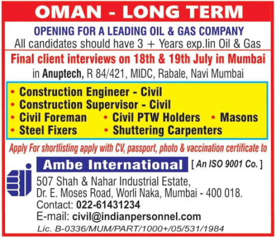 Shah & Nahar Industrial Estate, 507, Dr E Moses Rd, Worli Naka, Upper Worli, Worli, Mumbai, Maharashtra 400018, Call on 0091 22 61431234 Email: civil@indianpersonnel.com