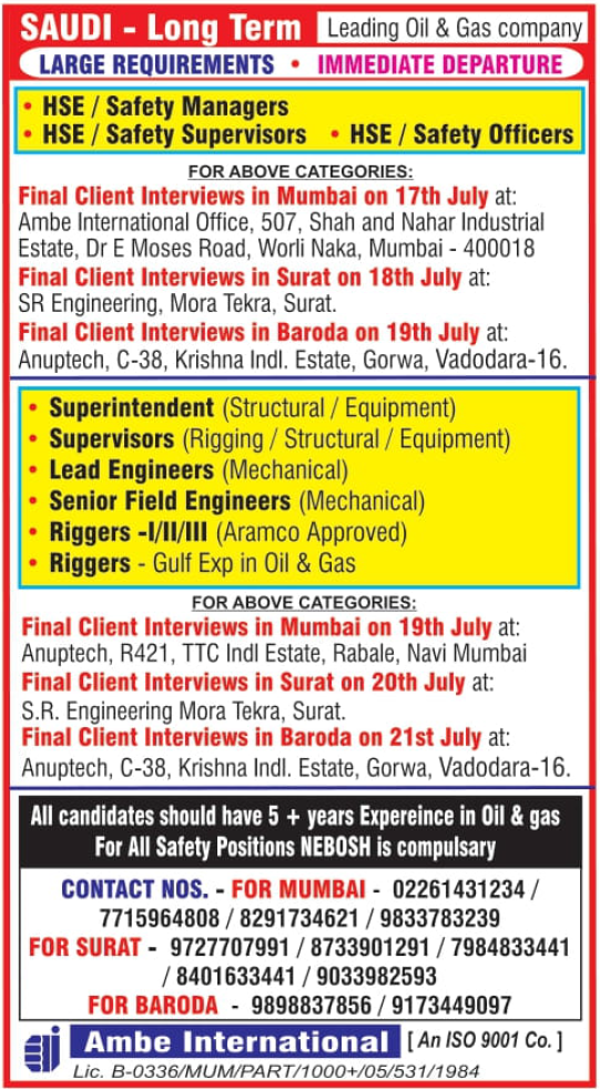 All Candidates should have 5 + Years Experience in Oil & Gas, For All Safety Positions NEBOSH is Compulsary