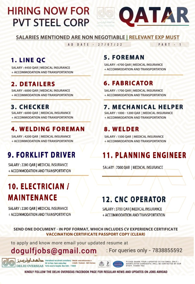 PVT Steel Corp Qatar jobs - Urgent hiring