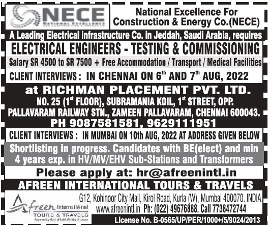 Candidates must have 4 years experience in HV/MV/EHV substations & transformers