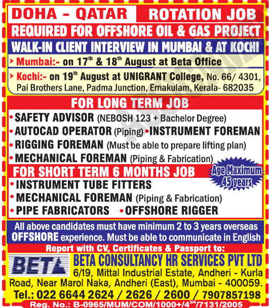 All Above Candidates must have minimum 2 to 3 years Overseas Offshore experience, must be able to communicate in English, Age Limit 45 years maximum