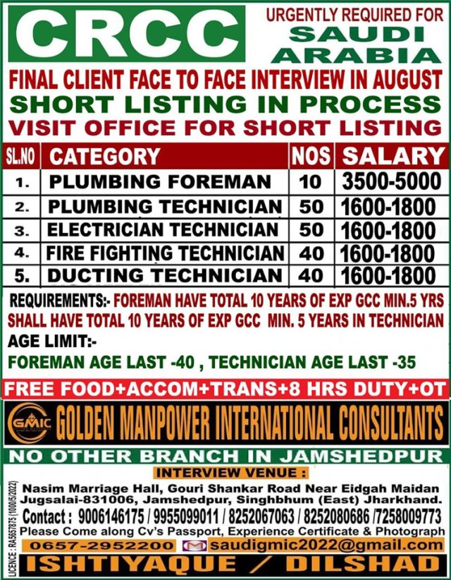 Vacancy in CRCC Company Saudi Arabia - Urgently required