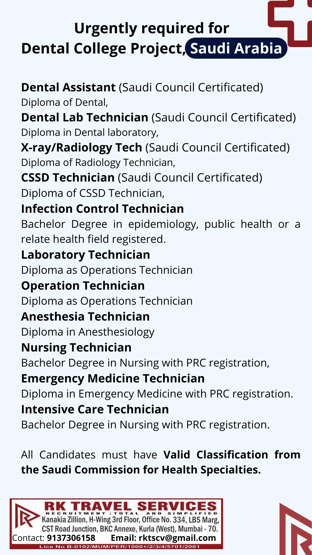 Candidates must have valid classification from the Saudi commission for health specialities