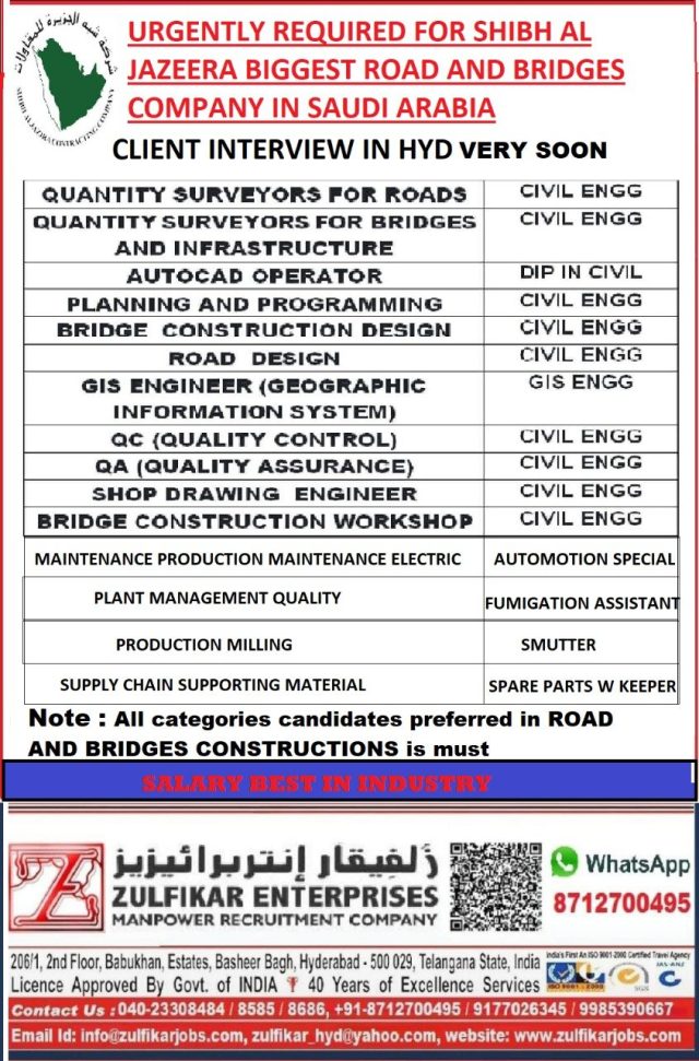 Candidates must have experience in road & bridge constructions