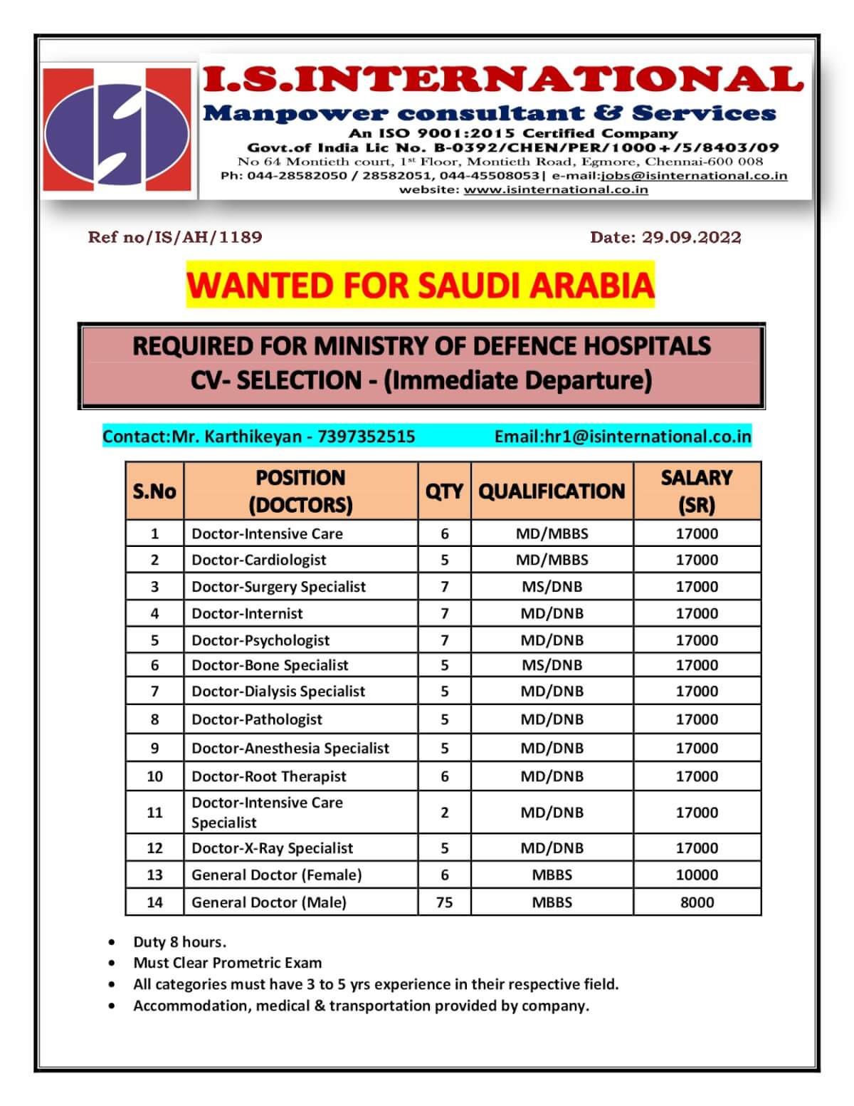 | Doctor - intensive care specialist | 2 | 17000 SAR |