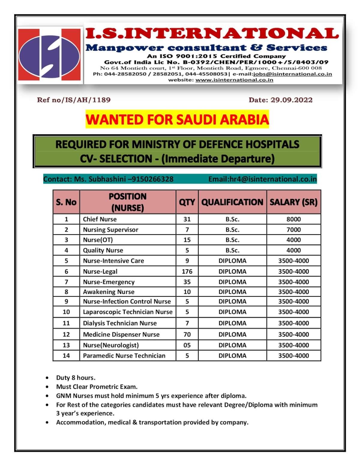 Email:hr4@isinternational.co.in, jobs@isinternational.co.in