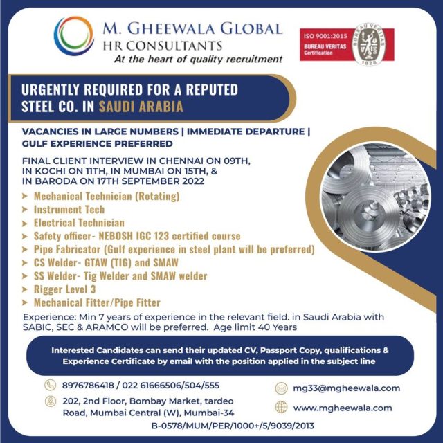 Minimum 7 years of experience in the relevant field. in Saudi Arabia with SABIC, SEC & ARAMCO will be preferred, Age limit 40 years