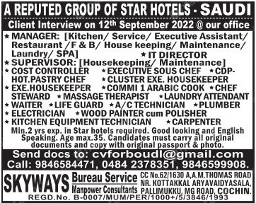 | Manager : (Kitchen/Service/Executive Assistant/Restaurant/F&B/Housekeeping/Maintenance/Laundry/SPA) | ||