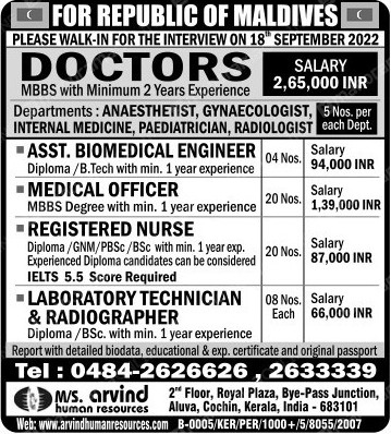Doctors - anesthetist, gynaecologist, internal medicine, pediatrician, radiologist | 5 no's per dept. | 265000 INR |
