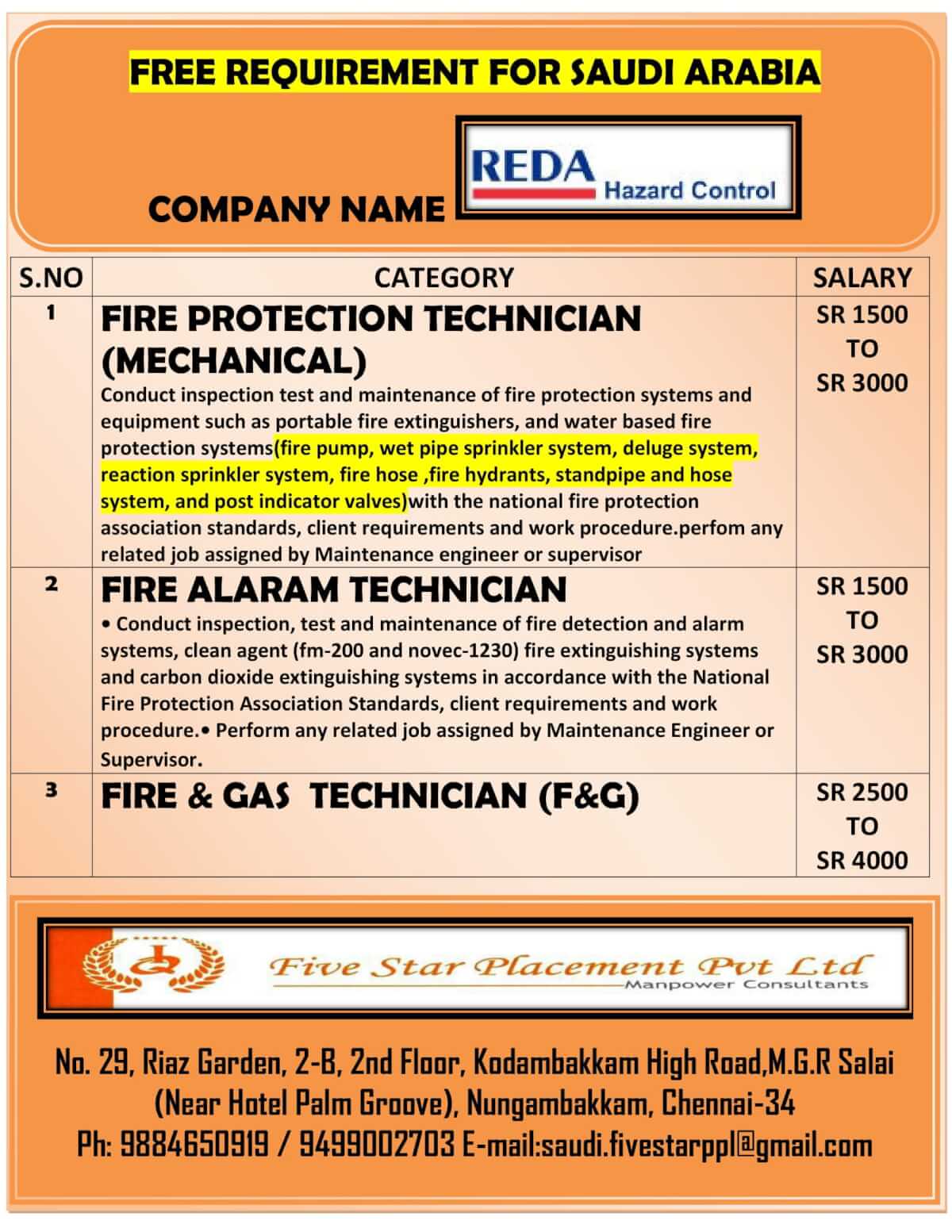 | Fire protection technician (mechanical) | 3000 SAR | |