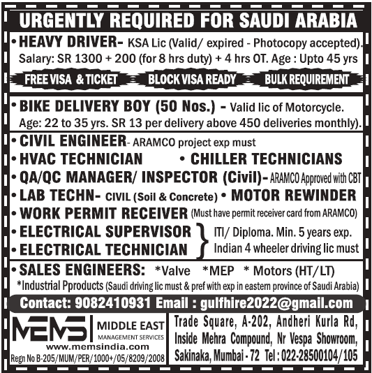 Urgent jobs in Saudi arabia - Free Visa & Ticket