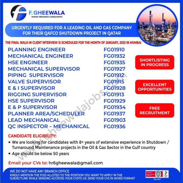 Candidates must have 8 + years experience in shutdown/turnaround maintenance projects in oil & gas sector in GCC