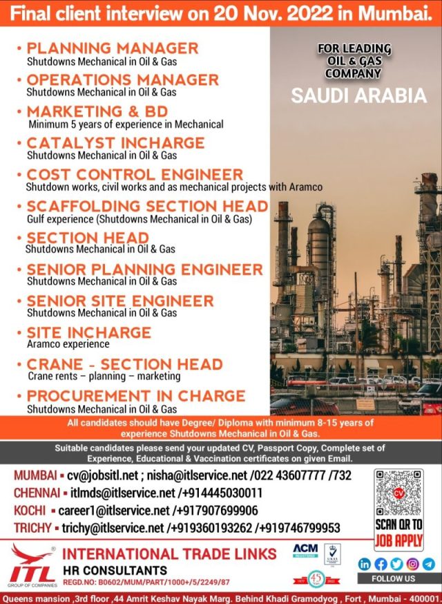 Candidates must have minimum 8 - 15 years experience in shutdown mechanical in oil & gas