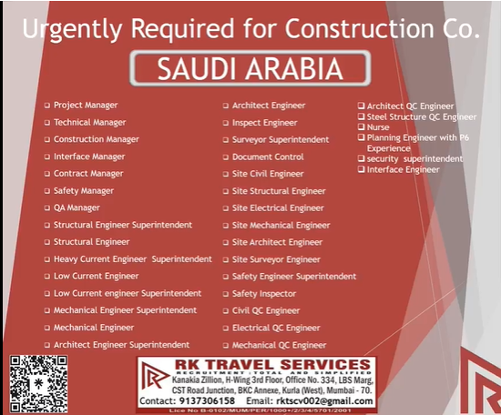 Saudi Arabia job vacancy for Indian - Construction Company
