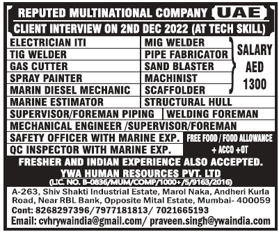 Walk-in-interview on 2nd Dec 2022 at Tech skill, Mumbai