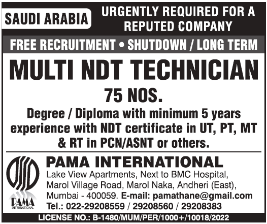 Minimum 5 years experience with NDT certificate in UT, PT, MT & RT in PCN/ASNT or others