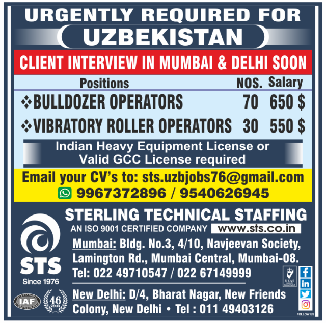 Email: sts.uzbjobs76@gmail.com/ Cont: 9967372896/9540626945