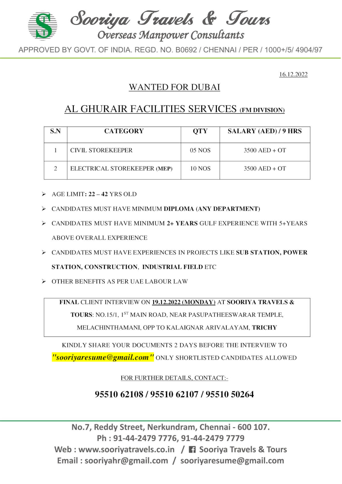 | Electrical Storekeeper (MEP) | 10 | 3500 AED |